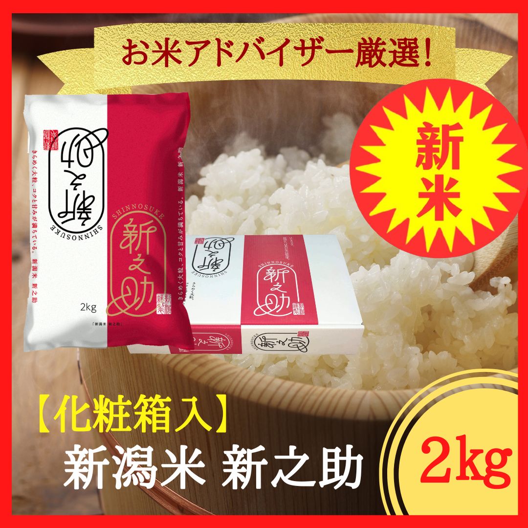 【令和7年産】 新米です。米づくりの伝統を極めた革新の品と質。毎日食べても飽きない新潟の新たな代表品種!大きな粒が自慢の「新之助」。炊き上がりはさらに美しく、お米がまぶしいほどに輝きます。これは、水をたっぷり吸い込みながら、ほどよい”粘り”をお米の表面まで届けているから。大粒で形の良い、ふっくらツヤツヤのご飯。見た目の美しさとあふれる存在感は、そのまま「新之助」の豊かな味わいに表れています。高いレベルで安定した食味・品質の新しいプレミアム米です!贈り物にも最適な専用2kg化粧箱入りでお届けいたします。